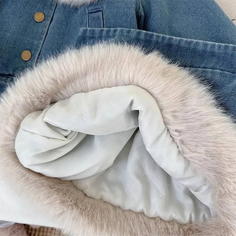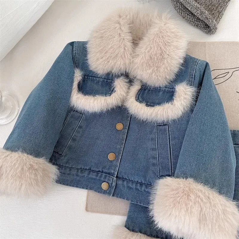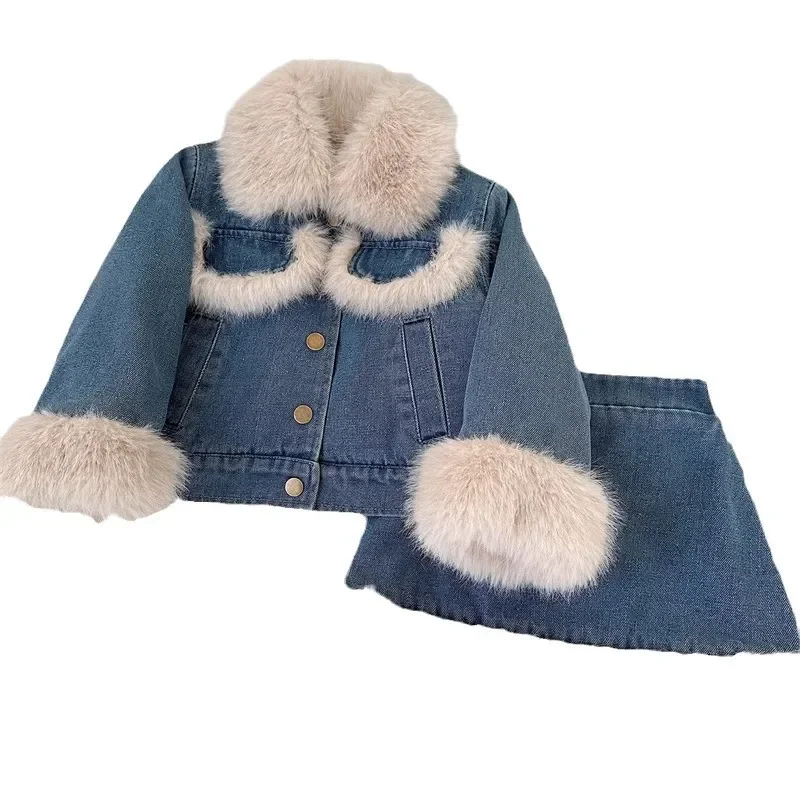 Coat and Skirt Set Girls Autumn and Winter New Korean Fashion Denim Thick Warm Jacket Skirt Two-piece Set Kids Clothes